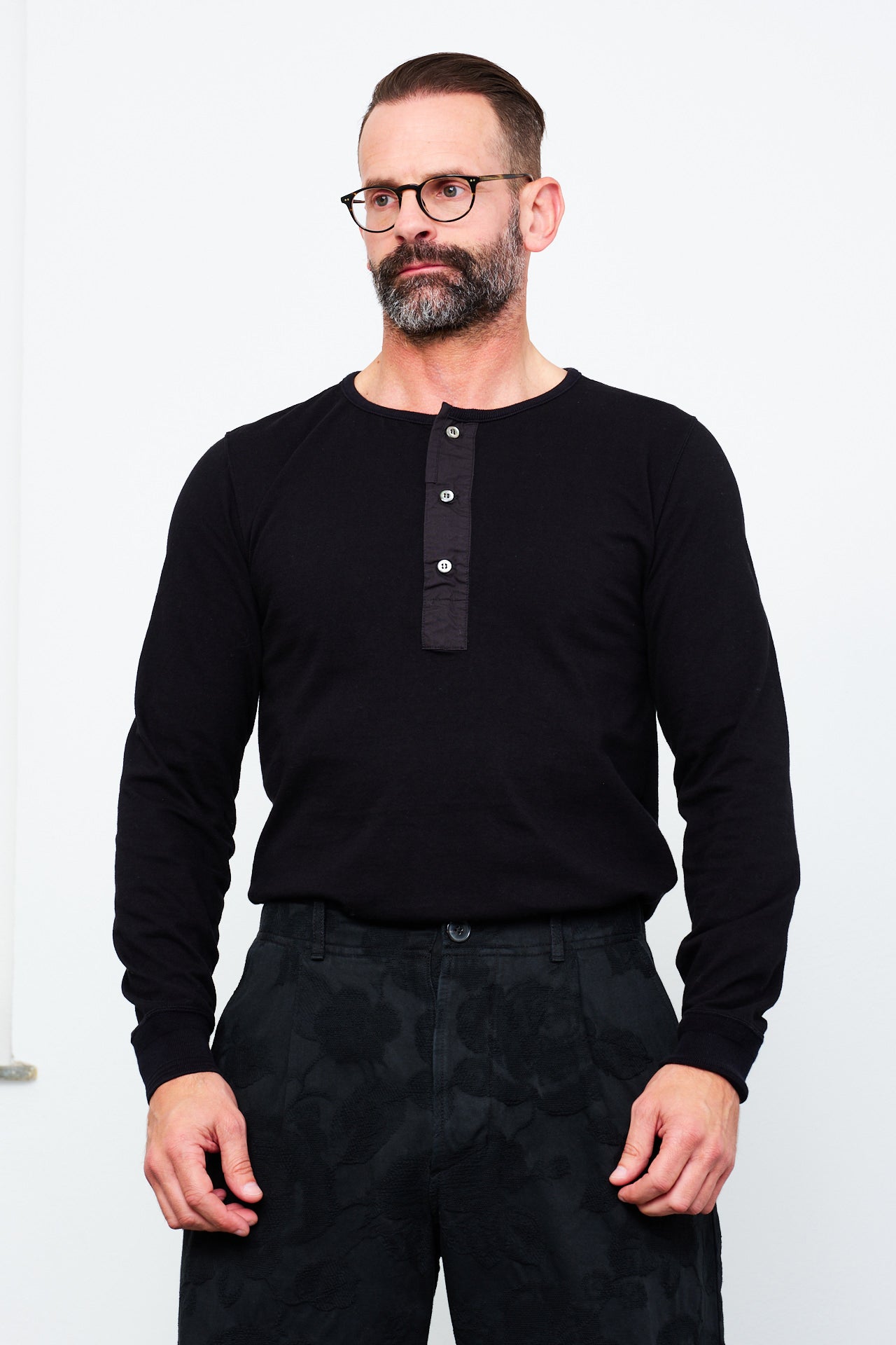 HANSEN GARMENTS authentic Henley shirt is made entirely in Japan using Japanese cotton jersey fabric. It has engineered rib at the cuffs which is fastened by a mother of pearl button and ribbed binding at the neck. The shirt fastens down the front with three more mother of pearl buttons on a poplin plaquet and there is a poplin facing on the inside back neck. Wear it as a top on its own or under a shirt for extra warmth. On top of that the carded treatment makes it soft to the touch.