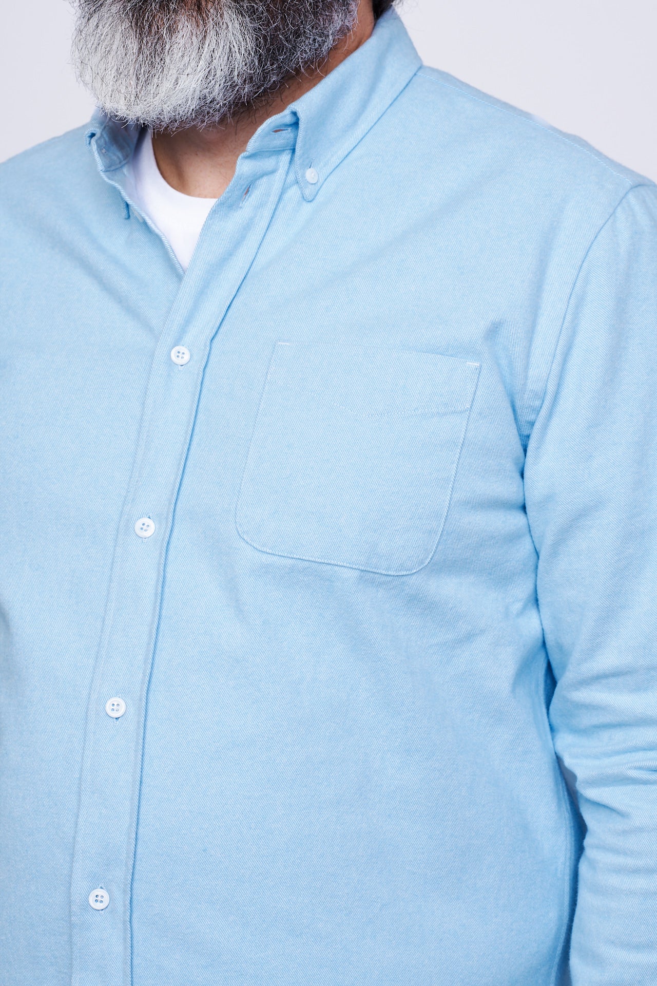 TENUE's Shirt "Ralph" is a modern take on true Ivy style: the button-down shirt. The perfect shirt for both casual and formal occasions. Ralph features a regular fit, a single chest pocket and mother-of-pearl buttons. The Tenue. Ralph Sky is made from a heavy-weight organic cotton left-hand twill with a peached surface, giving it a super soft hand feel while maintaining a sturdy structure. The fabric is so solid that you won't have to iron your shirt if you hang it to dry. This Ralph shirt is made in Tenues sartorial shirting factory near Treviso, Italy.