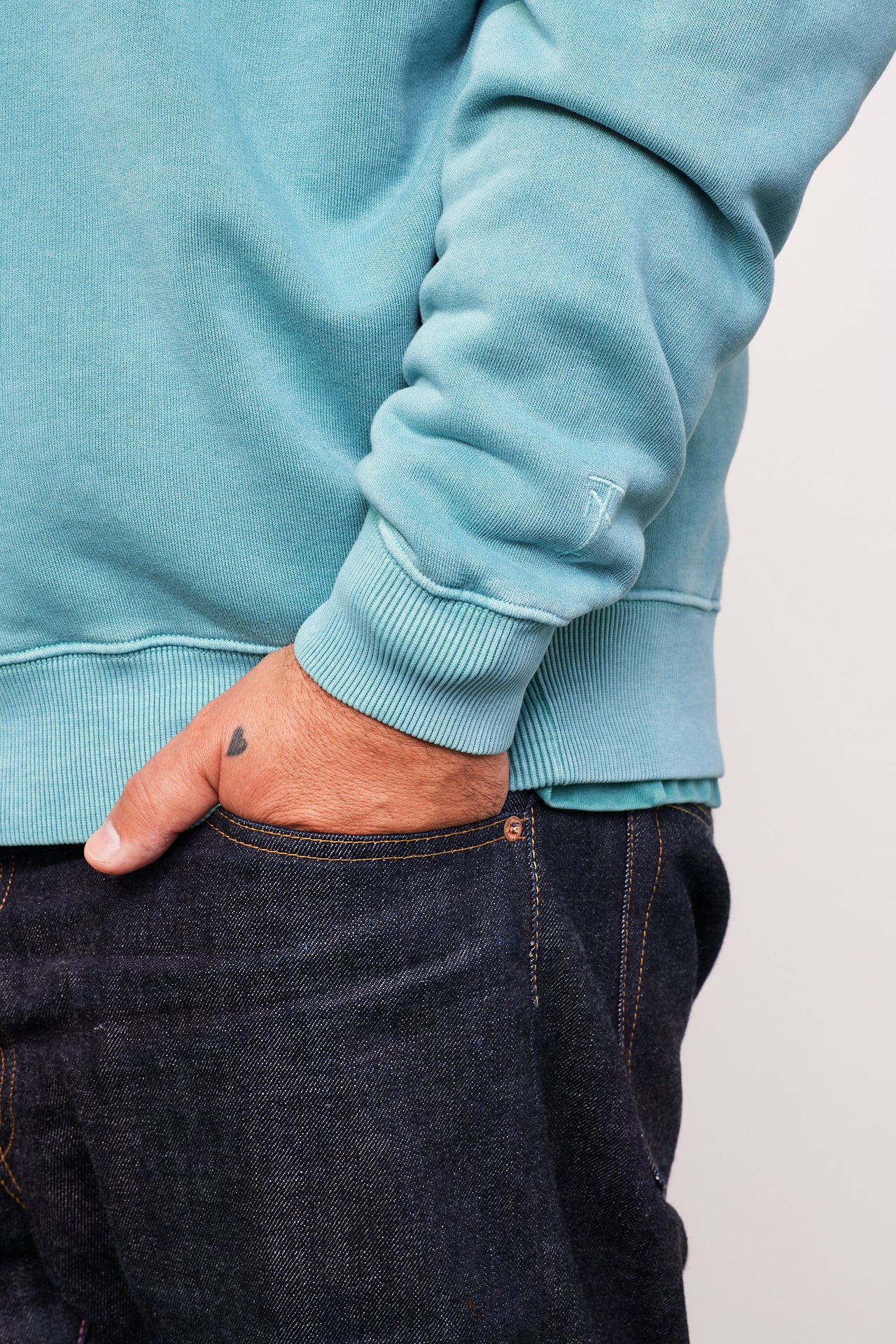 Tenue's "Kelly" Sweat in Trashed Emerald is a unisex crewneck sweat with an slightly oversized fit, designed to perfectly fit both men and women. The trashed Emerald colour of this garment is made from upcycled textile waste. The colour is created exclusively for Tenue. by their Italian partner. The Kelly-Sweat is made from a luxurious Japanese fleece with a buttery soft hand-feel thanks to a beautiful cotton and Tencel blend. A Tenue. logo embroidered on the chest pulls it all together. The "Kelly" is made in Tenue's jersey factory in Portugal.